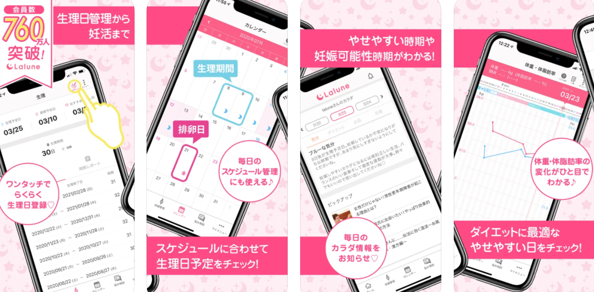 Lalune is another period tracker app developed with the concept of “providing peace of mind to [its] users.” Advanced artificial intelligence predicts users’ next period, ovulation, skin condition and dates you are likely to lose weight. This app is compatible with the digital basal thermometer brand Omron, so you can see your basal temperature on the app without having to log the data manually. Lalune also features an online forum where you can share your concerns about various female health issues with other users, providing a sense of community.
