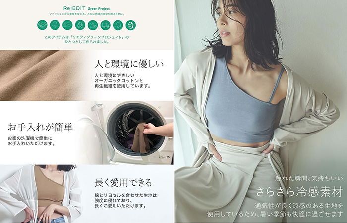 Re: Edit states that it considers it a responsibility to create, sell and manufacture fashion in a sustainable manner so that the world will be a better place one hundred years from now. One example of this is the company’s Soy Bean series. By using plant-derived soy fiber, Re: Edit has been able to create breathable fabrics that fit comfortably. The fiber also provides UV protection and antibacterial sterilization. The Soy Bean series is one of many projects that has been launched by Re: Edit in order to promote sustainability.