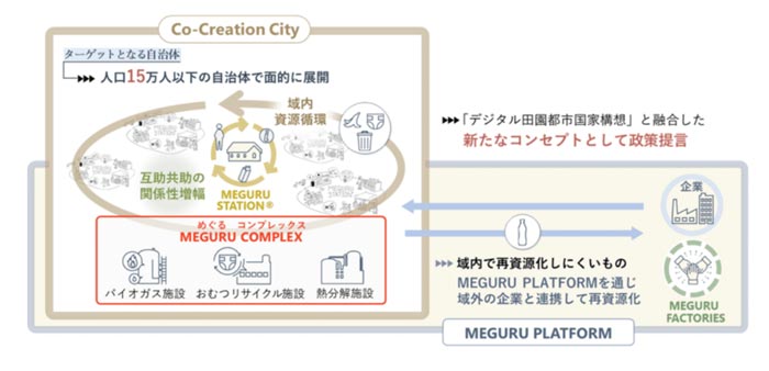 Resources difficult to recycle locally are connected with external recyclers or “MEGURU FACTORIES,” which have the necessary technology, and supplied as new raw materials to external companies. The digital information platform “MEGURU PLATFORM,” which aggregates resource information collected locally, allows for the analysis of consumption behavior, enabling forecasts for purchase, procurement, behavior, and regional customization. This allows companies to optimize production and services rather than speculate. Furthermore, by procuring raw materials recycled at MEGURU COMPLEX locally, companies can engage in ESG-compliant activities.