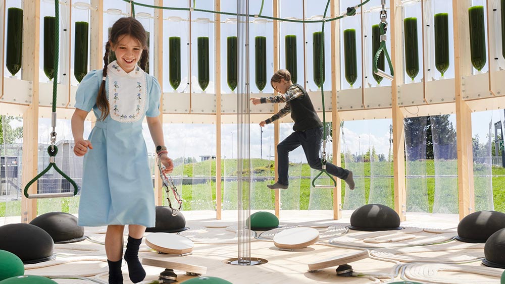 Among the winners is AirBubble, the world’s first biotechnological playground that integrates air-purifying micro-algae cultures. Designed by ecoLogicStudio, this project creates a purified microclimate for children to play in, and incorporates a cylindrical timber structure wrapped in an ETFE membrane protecting 52 glass algae reactors.