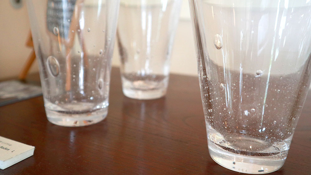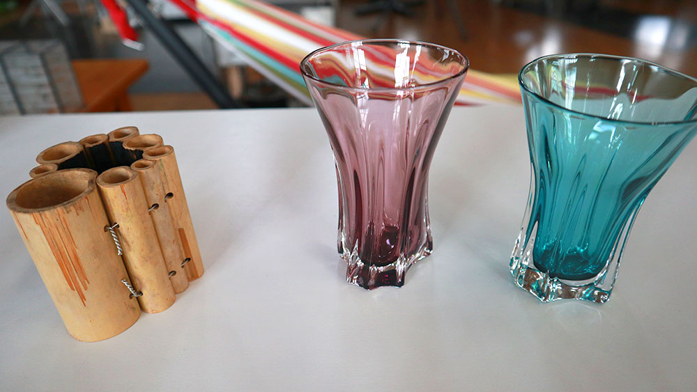It is also here that Inoue discovered the intrinsic relationship between bamboo and glass. Bamboo is widely grown in Oita prefecture, and have similar elements with glass. To express that relationship, Inoue has created a line named “KAGUYA”. Another unique piece to look for is “baden”, which uses the famous hot spring water in creation of this series. These are but some of the many inspirations which Inoue demonstrates with his skills.