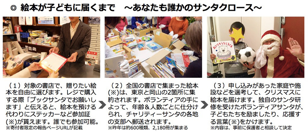 Book Santa started in 2017 as a social contribution project which people can participate in during Christmas season. In this project, children’s books, purchased at registered bookstores, are donated and distributed to those in need, such as families that struggle financially or have survived a natural disaster, the recent torrential rain in western Japan for an instance.