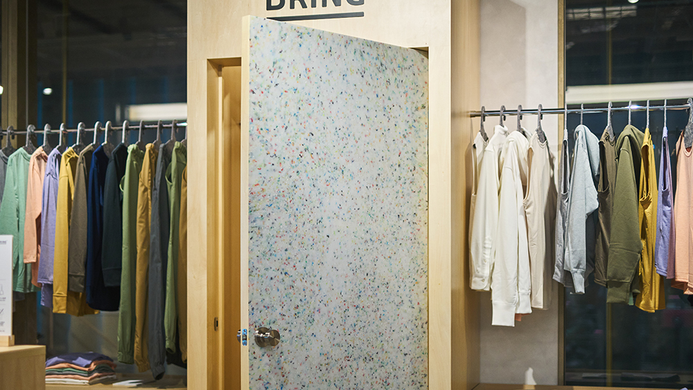 BRING™ produces functional, all-gender apparel using BRING Material™, a recycled polyester derived from post-consumer textiles. While the clothing promotes circularity, the new store takes the concept further by using recycled materials for its interior design and fixtures. The shop counter and fitting rooms are constructed from boards made by REMARE Co., Ltd., which recycles marine and composite plastics.