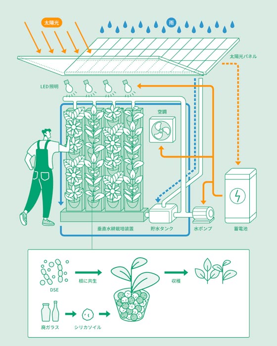 The project is founded on five sustainable/circular concepts: the circulation of water through rainwater harvesting, symbiosis with microbes for efficient cultivation, resource circulation by using recycled glass, renewable energy from solar and wind power, and an agriculture-welfare collaboration that provides employment opportunities for people with disabilities.