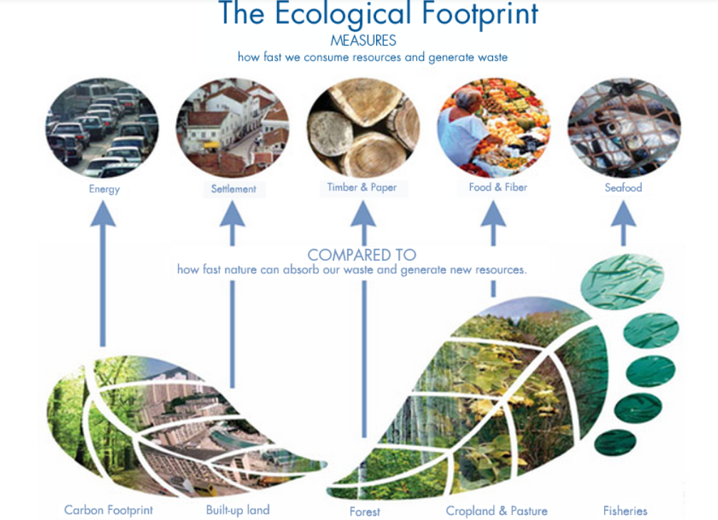 The ecological footprint measures the supply and demand of nature. That is, we can use it to compare how a population consumes natural resources and how much the environment provides to sustain their lifestyle.