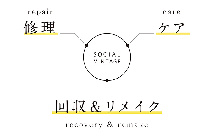 SOCIAL VINTAGE is a service offered by MOTHERHOUSE. It focuses on three areas: care, repair, recovery & remake. The intention behind this service is to provide support to customers to extend the lifespan of products and encourage a sustainable lifestyle. This service is available both in stores and online.