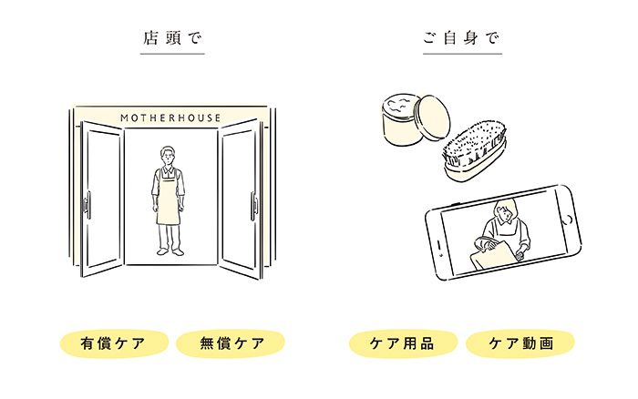 Customers can also take care of their products at home by purchasing appropriate care products and tools sold by MOTHERHOUSE. Instructional videos will be provided.
