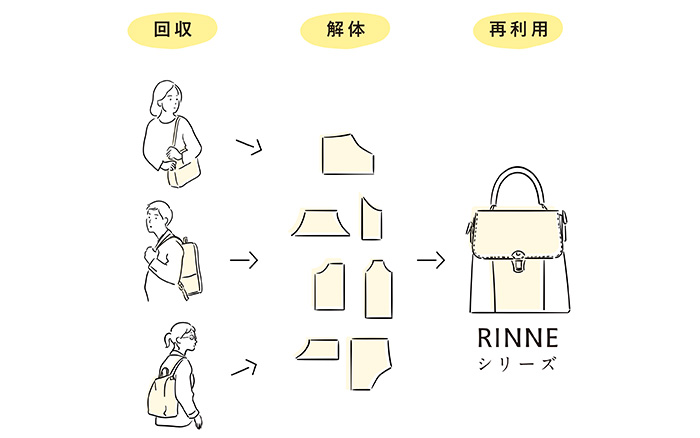 Recovered and remade leather bags are launched under the RINNE series. Due to the manufacturing nature of these products, there is only one of each design. The skilled craftsmanship allows customers to enjoy a blend of old and new in a single product.