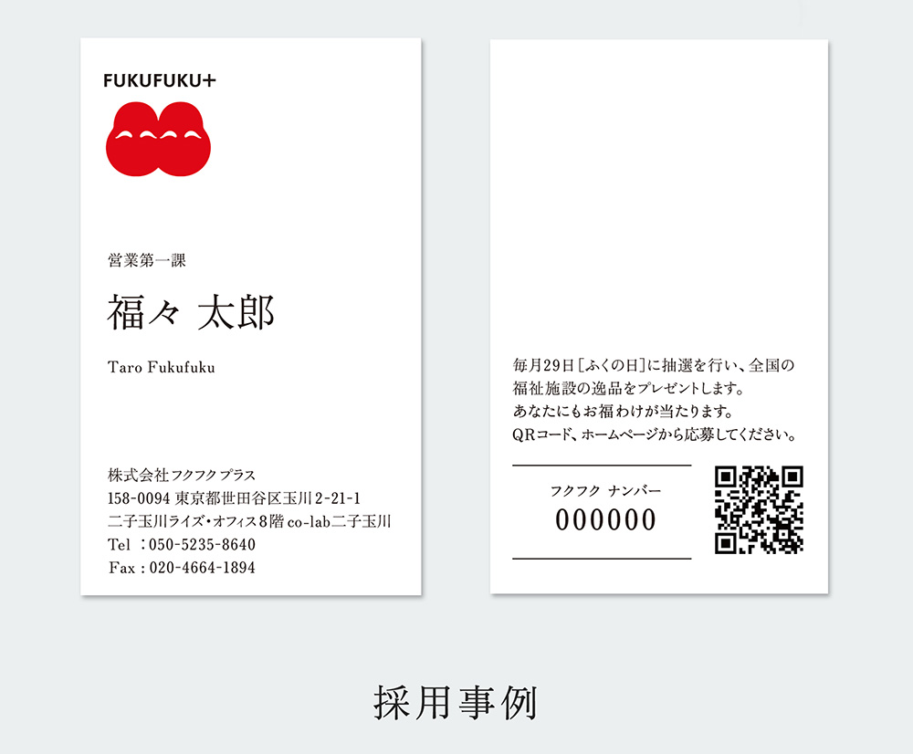 Their first starter kit provides its users with a set of QR codes and numbers, which gives the ability to attach them to variety of items, such as a leaflet or business card. Their second starter kit is a set of 100 small cards that include the QR code, FukuFuku Plus’ business logo, and an explanation of the Fukubiki Service.