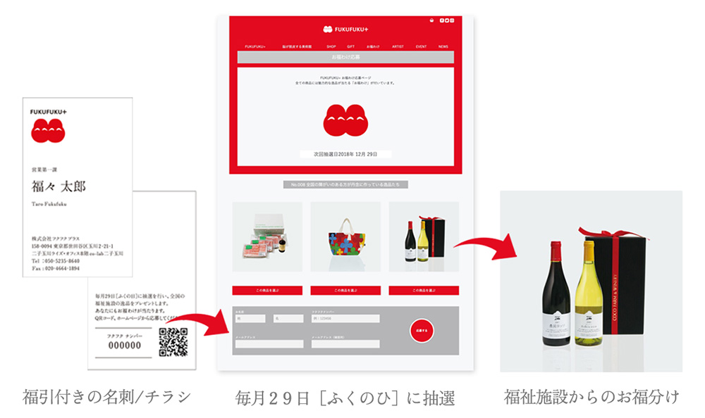 Fukufuku Plus is a venture company created by members who hold many achievements in social design. They aim to be business innovators that provide support to people with disabilities. The Fukubiki Plus Service is a perfect way to promote products and business of disabled people from all over Japan.