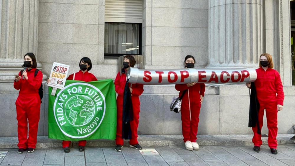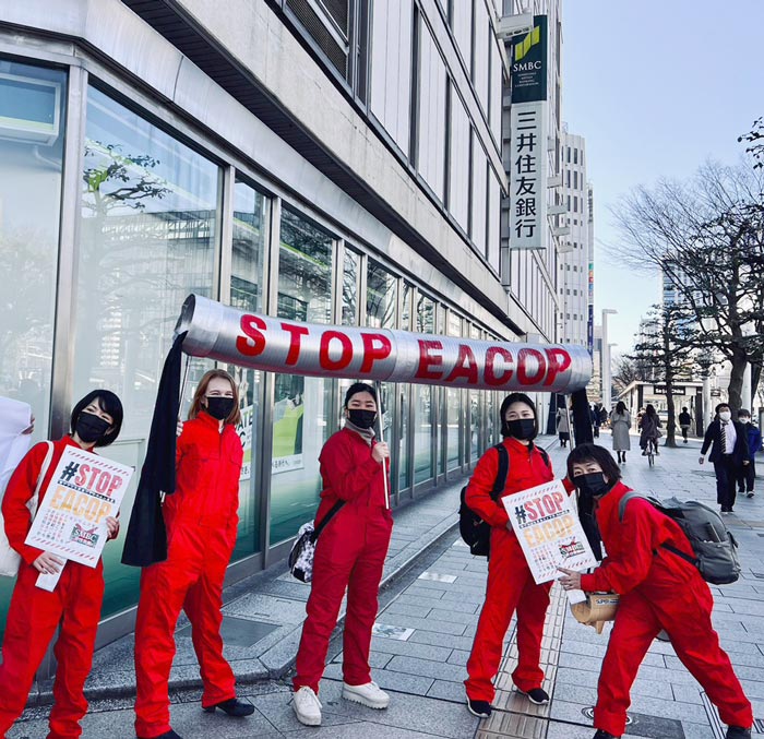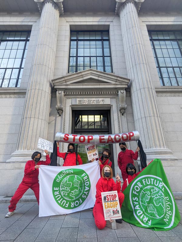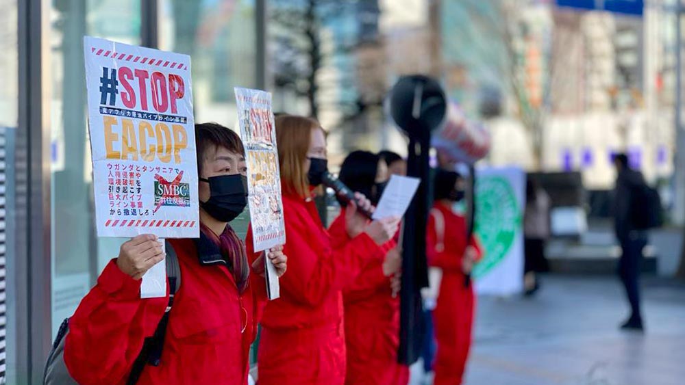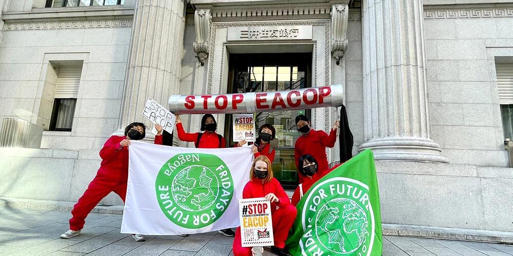 Wednesday’s #StopEACOP was an international demonstration held in various cities around the world to protest the construction of the world’s largest crude oil pipeline, the East African Crude Oil Pipeline (EACOP). Held in four cities in Japan, Fukuoka, Nagoya, Sendai and Tokyo, this opportunity was important for the Japanese to learn about the accountability of Japan’s banks, as the pipeline is not known in Japan. While some Japanese banks have officially distanced themselves from the project, banks like Sumitomo Mitsui Banking Corporation (SMBC) and MUFG Bank (Mitsubishi UFJ Financial Group) continue their association.
