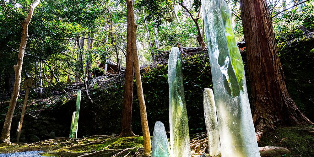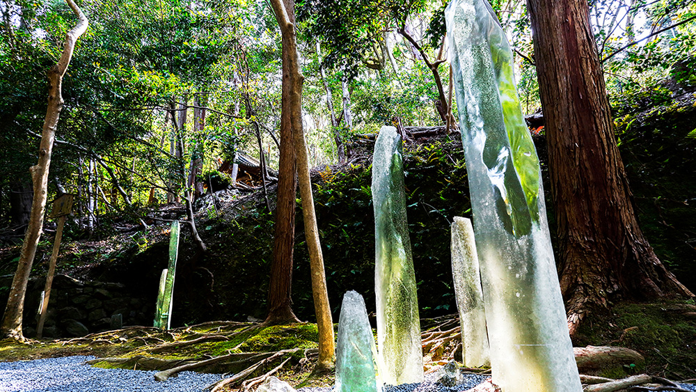 Titled ‘Eternal Affinity,’ the artwork lines the 40-meter pathway from Honen-in Temple’s main gate to the temple gate. It consists of thick rods of olive-green glass – the tallest at 180 centimeters tall – and other smaller and horizontal glass pieces that resemble the rocks of a traditional karesansui dry garden. Moss and pebbles complete the piece.