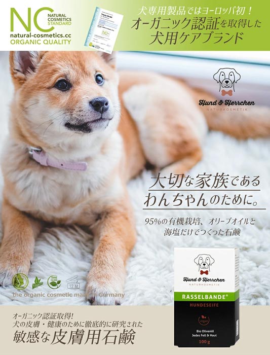 The manufacturing brand “Hund & Herrchen” was the first in Europe to obtain organic certification for dog-specific products. They do not use any artificial fragrances, palm oil, artificial colors or other ingredients that could negatively impact the natural environment or cause skin problems for dogs.