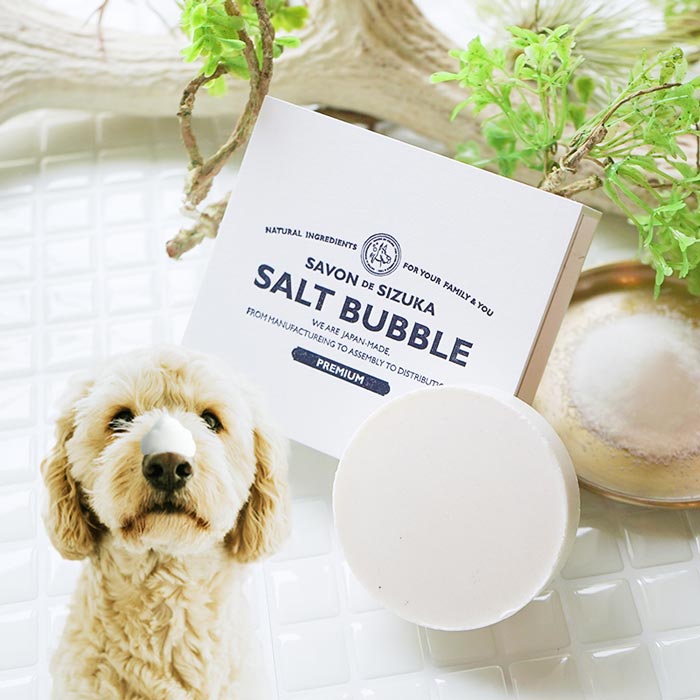 Salt Bubble Premium soap shampoo is blended with salt from the Genkai-nada and Seto Inland Sea and beauty ingredients that are gentle on both the hands and skin of the person washing the dog. It also contains horse oil (Koune) for moisturizing effect. It does not contain any additives such as petroleum-based surfactants, synthetic foaming agents, or chelating agents.