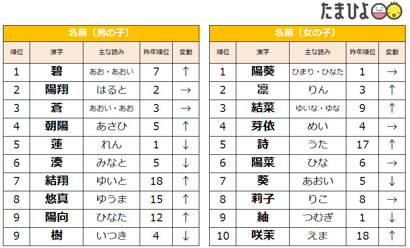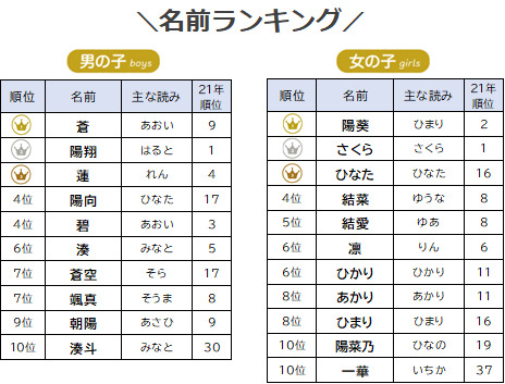 Rankings conducted by Akachan Honpo. The left is the top ten boys’ names, and the right is the top ten girls’ names. Gender-neutral names, such as Aoi and Hinata ranked in. (Image: PR TIMES)
