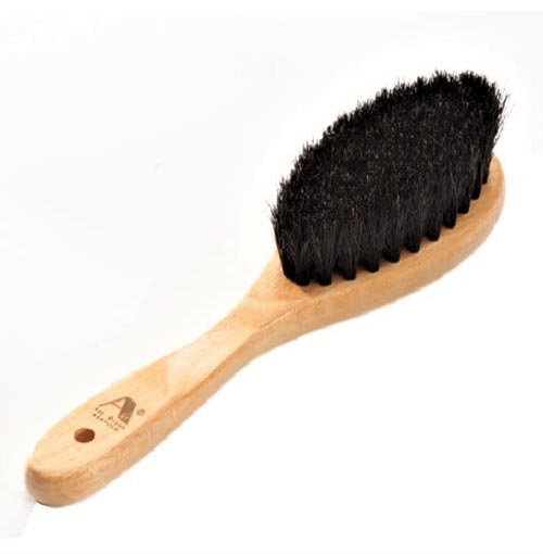 This particular brush is suitable for brushing soft hair. White birch natural wood is used for the brush base. Black horse tail hair they use for the brush is much softer than wild boar hair.