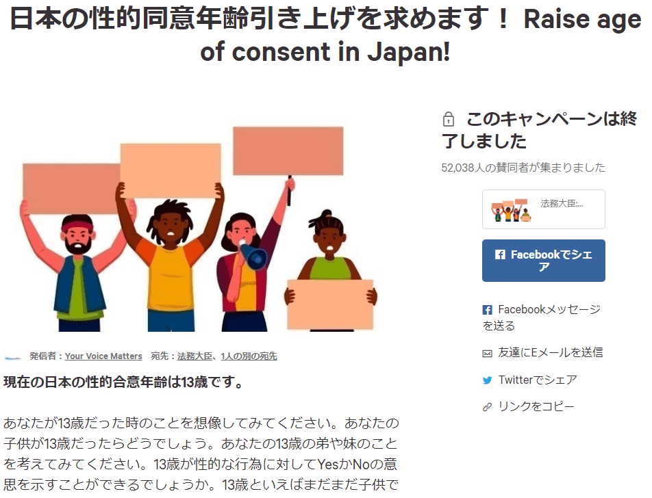 In November 2020, a campaign group, Your Voice Matters, submitted a petition to the Ministry of Justice, requesting that Japan’s legal age of consent be raised from 13 to 16. The group was organized by female university students who were saddened to learn how low Japan’s age of consent is. The campaign collected more than 50,000 signatures on Change.org.
