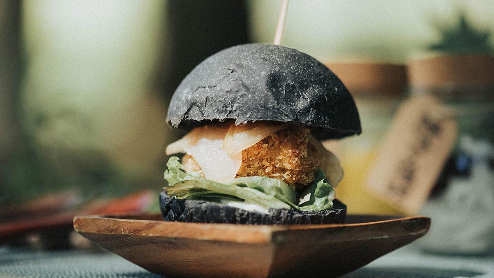 A Shiitake burger in charcoal buns is the star of the “Forest Restaurant.”