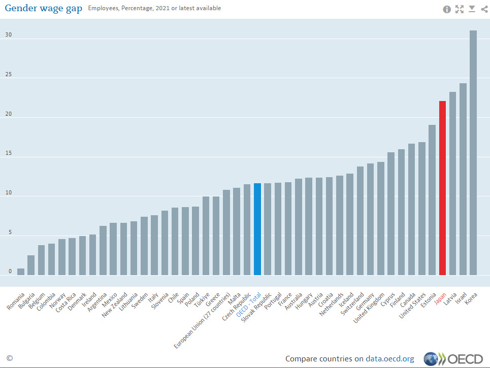 According to an OECD study, the median income of women in Japan is 78% of the median income of men. Japan has the third-largest gap among OECD countries.