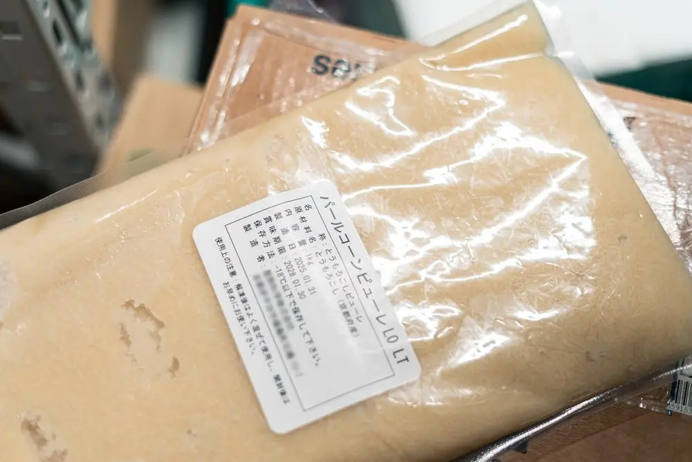 Minato: “To process products in a factory, you need to bring in a minimum amount. Bringing in 500 to 1,000 kilograms per batch allows us to process efficiently. For pearl corn, which is in its third year in 2025, we take in about six tonnes of off-spec produce annually. We have a partner factory in the City remove the kernels, which we store in our freezers. The kernels are then processed into purée at another Kyoto processing company, and we store it again in our freezers until sale.”
