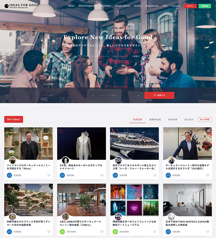 It provides two of its services – IDEAS Explorer and a newsletter – free of charge to anyone who registers as a member. IDEAS Explorer allows searching through IDEAS FOR GOOD articles specified by industry, issue, solution, SDG or country, which is useful for research or to generate ideas. The newsletter contains selected topics gleaned from IDEAS FOR GOOD’s extensive overseas research, and will be distributed once a month.
