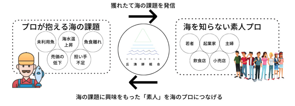 Mizutani: I have learned a lot about the challenges facing the ocean through my interactions with fishermen, but I can’t fish and handle fish, so I was worried about being too knowledgeable but not having the necessary hands-on experience. However, I came to think that it might be a necessary element to solve the ocean problems because I can think from multiple angles. Then, I started the project ‘Oka Ryoshi Kumiai’ based on the concept of thinking about the sea from the hillside (Oka in Japanese), inspired by the ‘hill surfer’ who is dressed as a surfer but does not actually surf.