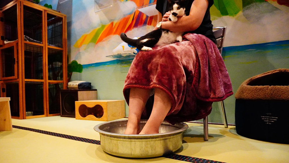 Unlike your typical cat cafe, Neko Yokujou is heavily inspired by the concept of a traditional Japanese bathhouse. Although not an actual bathhouse, the cafe incorporates several elements that one can find in their local bathhouse. Customers can enter the cafe for a fee, with the option of a free flow of drinks. Footbaths are also available at the cafe.