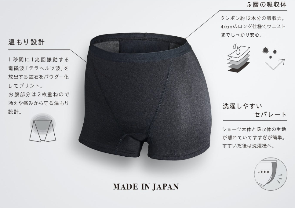 Five obsorbent layers cover up to the waist. The absorbent part is detachable for a handwash. Thermal Terahertz waves keep your lower abdomen warm. (Image: camp-fire.jp)