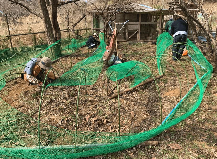 The circular path leading to the chicken coop is being created. The chickens walk and defecate there, which becomes fertilizer and helps to grow fruit trees. (Image: Sonoka Imagawa)