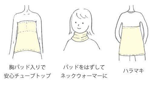 - A haramaki tube top, which comes with a long torso to keep the wearer’s abdominal area warm. When you remove the bra cups, this top can be used as a neck warmer.