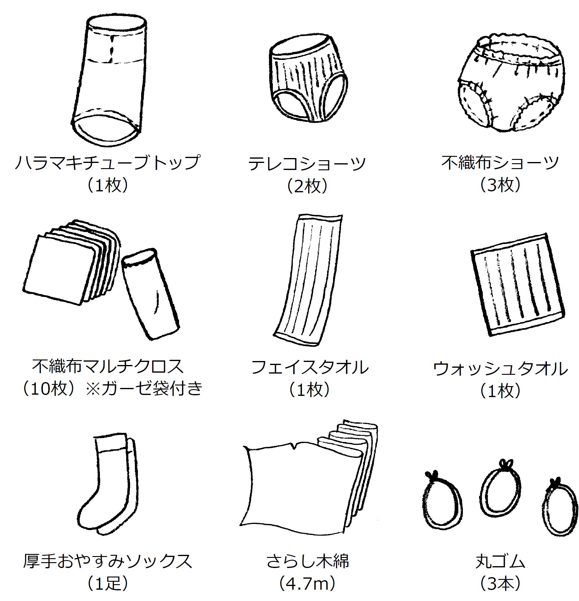 - A furoshiki wrapping cloth, the outer packaging of this kit, which can be used in a number of versatile ways such as for a breastfeeding cover, head wrap, sleeping eye mask, or blanket.