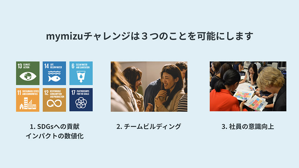 Three possibilities from mymizu challenge. 1. Contribution to SDGs. 2. Team building. 3. Awareness among employees. (Image: mymizu.co)