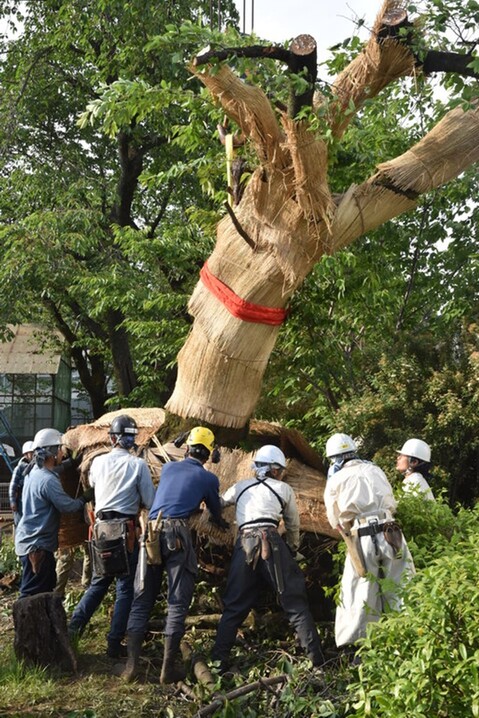 The unprecedented rescue project started on May 3. Experts trained in Yano’s methodology gathered from all over the country, as far as from Hokkaido. Each tree was trimmed, wrapped and gathered to support one another standing on the moat of old bamboo trunks, charcoals and other natural materials. Shaved-off branches and leaves were turned into chips, which were then scattered to cover the roots. Nothing went to waste, in other words.