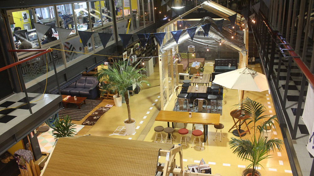 This used to be the office of a local printing company Nakagawa Advertising. Post-renovation, its first floor now includes a lounge, a kitchen and an Airbnb-registered dormitory. A share office and co-working space is also located on the second floor. You can see traces of the building’s original function as a printing plant in its new form.