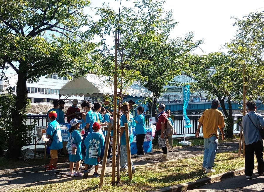Around 4 o’clock in the evening, as we exited from Keihan Tenmabashi Station and crossed Tenmabashi Bridge, we turned right to follow the path along the river. There, we spotted an Eco Station. Volunteers were preparing for what promised to be a hectic period, discussing procedures and tasks. When we asked for a photo, they kindly smiled for the camera. It was infectious, and we couldn’t help but return their smiles, offering words of encouragement, “Good luck!”
