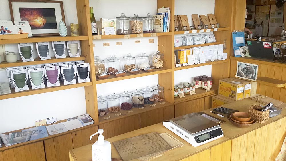 The bulk store can be self-operated, or the staff will happily assist you if you are unsure of how the system works. The weighing machine is laid on the counter, for use with the containers you bring or the paper bags provided by the cafe. Vegetables are also available for purchase, along with an assortment of eco-friendly products.