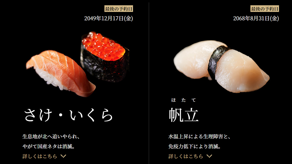 The campaign has a special web page, which shares the last day of each sushi ingredient. According to the forecast, 9 popular sushi ingredients are at risk of disappearing in the near future, including cuttlefish (the first to disappear by 2035), salmon and salmon roe (2049), sea urchin (2073) and sea bream (2094). People who visit the website and Twitter can reserve tables at Ginza Kyubey on the date that is predicted to be the last day of each ingredient.