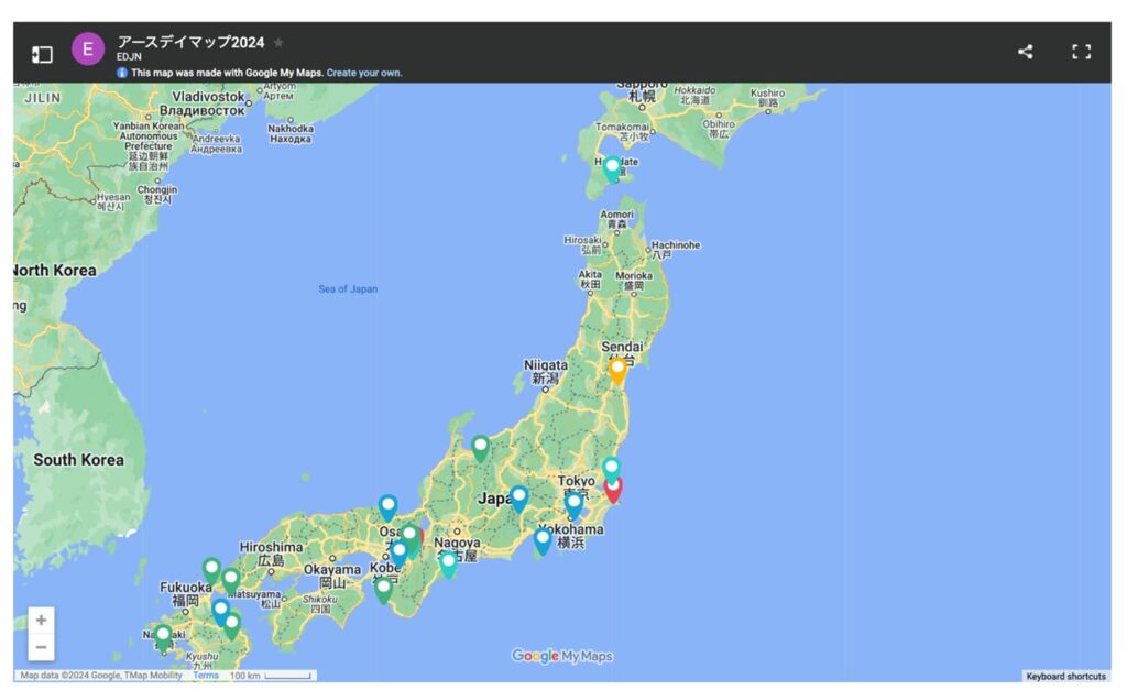 Earth Day events are planned in major cities across Japan (see the map below). In Tokyo, the celebrations span over two weekends. On April 13 and 14, there will be an outdoor concert in Yoyogi Park. Food stalls, fun learning activities for families and disaster preparedness sessions will be available as well. On April 20 and 21, another market in Miyashita Park will feature artists selling handmade items and a traditional dance for all to jump in.
