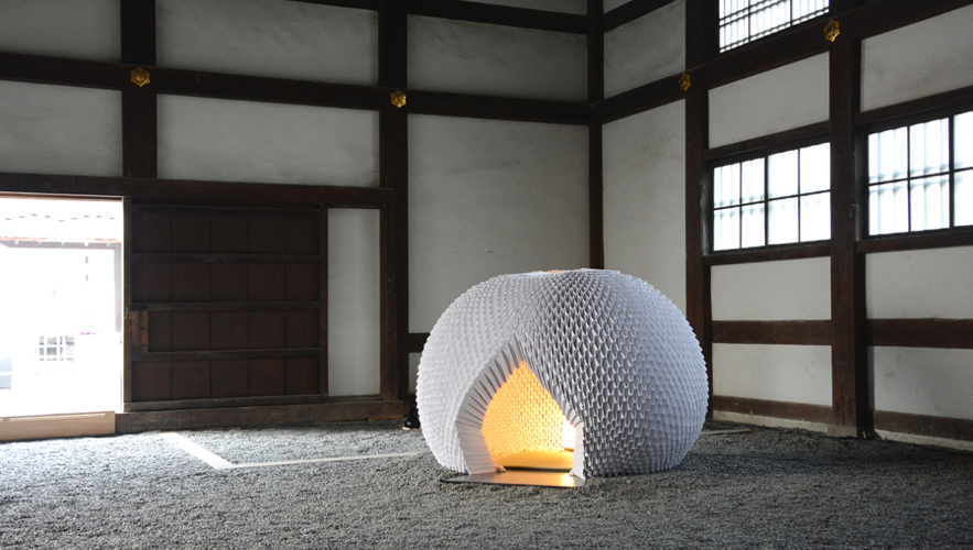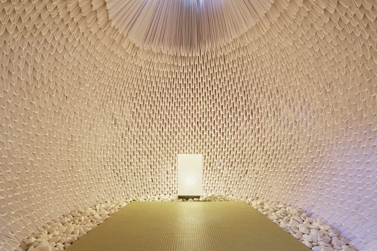 Mr. Katagiri, of Katagiri Architecture+Design says, “The small tea room, made from 4,000 pieces of origami paper pieced together, is a tea room from Japan’s traditional culture — a space made from simplified beauty. It also resembles the repeated cell division of life forms.”