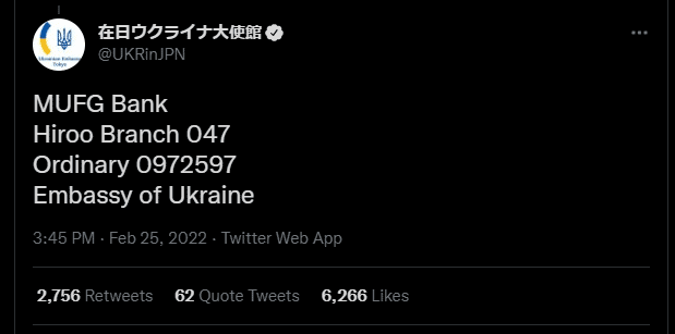 Screenshot of tweet from the Embassy of Ukraine in Japan [MUFG Bank, Hiroo Branch 047, Ordinary 0972597, Embassy of Ukraine].