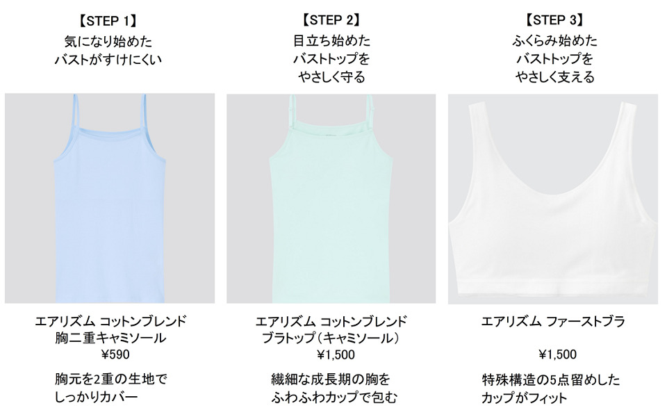 To address young girls and their parents’ challenges and worries around growing bodies, UNIQLO already offers particular undershirts and a bra in their kids line. This collection comes in three types, Girls AIRism Cotton Blend Chest Two-layer Camisole, Girls AIRism Cotton Blend Bra Top and Girls AIRism First Bra. Therefore, customers can choose items according to the child’s development. These undergarments protect and gently support growing, sensitive breasts at each development point.