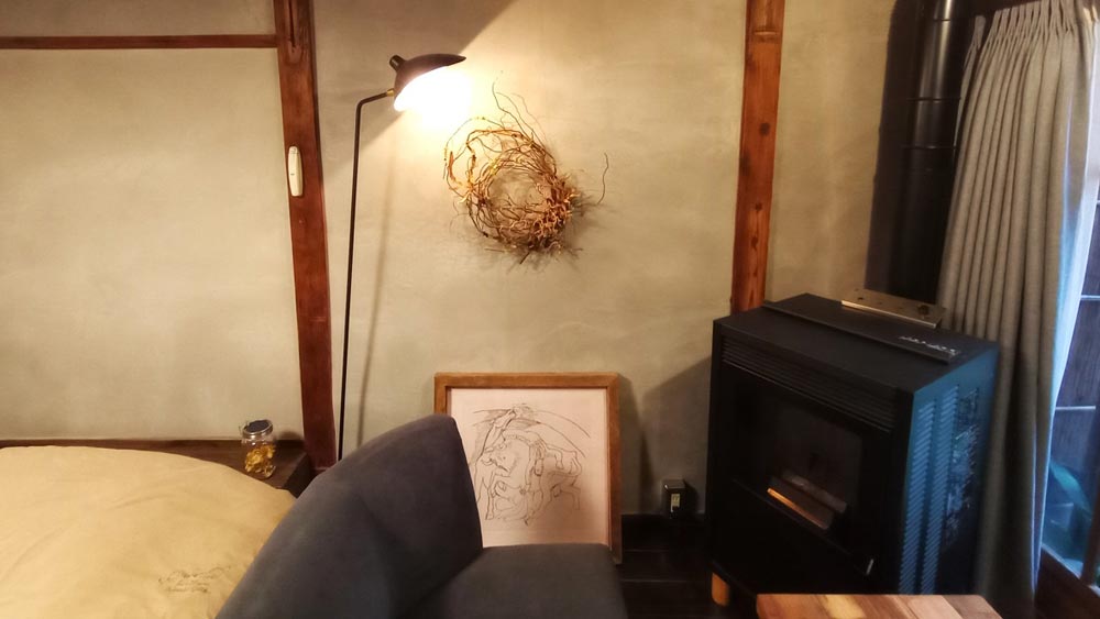 Next, you’ll notice the environmentally friendly pellet stove that uses biomass energy, TOYOTOMI’s “MUUMUU”, funded through crowdfunding. It exudes an impressive aura, making you want to experience a stay in winter. The stove burns compressed waste wood from Kitayama in Kyoto, which, according to Kayoko, “burns really well due to its high density.”