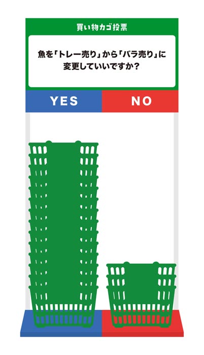 “Shopping Basket Voting” works by giving shoppers the option to answer questions from supermarkets as they return their shopping baskets. Customers can deposit their baskets in either a “YES” or “NO” return area, thereby casting their vote on proposed changes, such as whether to install bulk refill stations or add doors to refrigerated sections to save energy.