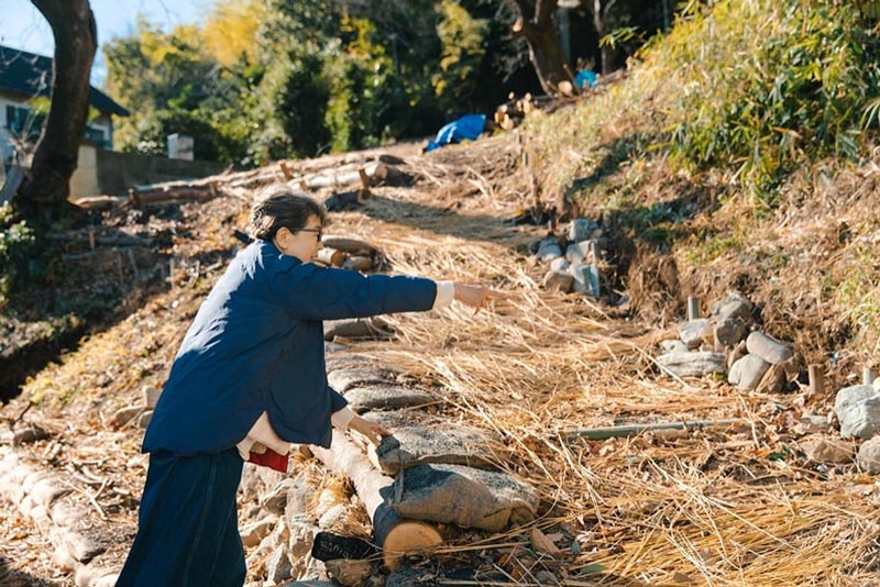 Sakaue also describes Jike as a place where the idea of circulation becomes tangible. With guidance from Hiroomi Takada, an environmental civil engineering expert who draws on traditional knowledge to improve conditions from the soil up, she began restoring the hillside behind JIKE STUDIO. The area had lost its ability to hold water after extensive logging.