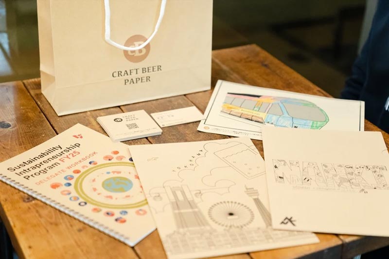 The company’s CRAFT BEER PAPER, which has a warm, amber color, is used to create a variety of items such as paper bags, folders, and business cards. Converting malt lees into paper products opens up more applications for the material, and gives it greater value by making it visible and useful. Several local breweries in Yokohama are now collaborating to create this circular approach, with some utilising this CRAFT BEER PAPER to create their menus.